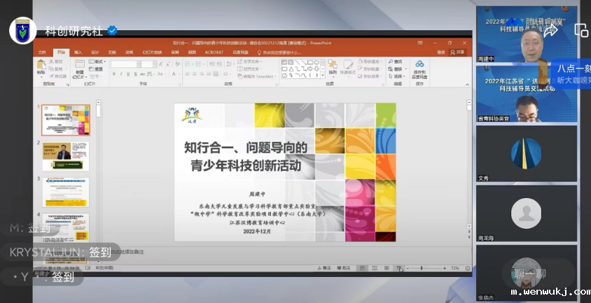 12月12日下午,中国科协“做中学”科学教育改革实验项目教学中心周建中副主任作了题为《知行合一、问题导向的青少年科技创新活动》的讲座,介绍了科技创新活动的构成、科学研究与工程设计流程,强调知行合一,倡导做中学、用中学、创中学,注重引导学生参与学科探究活动,开展跨学科实践,经历发现问题、解决问题、建构知识、运用知识的过程,让认识基于实践、通过实践得到提升。