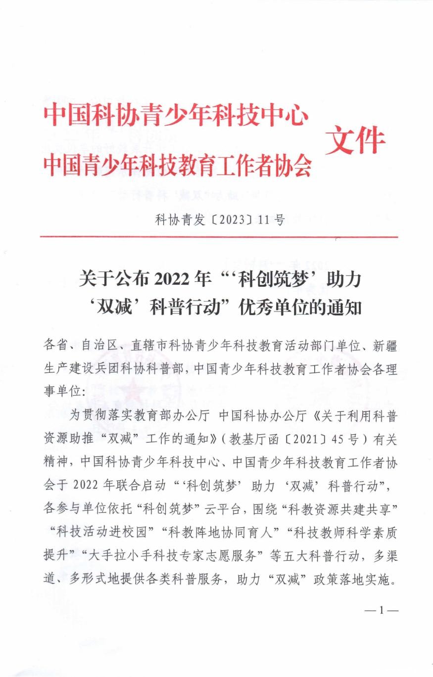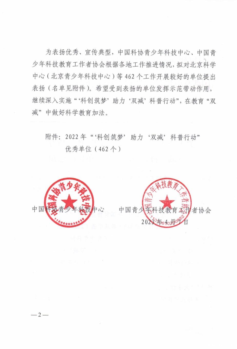 近日,中国科协青少年科技中心、中国青少年科技教育工作者协会印发《关于公布2022年“‘科创筑梦’助力‘双减’科普行动”优秀单位的通知》,betway软件荣获2022年“‘科创筑梦’助力‘双减’科普行动”优秀单位。