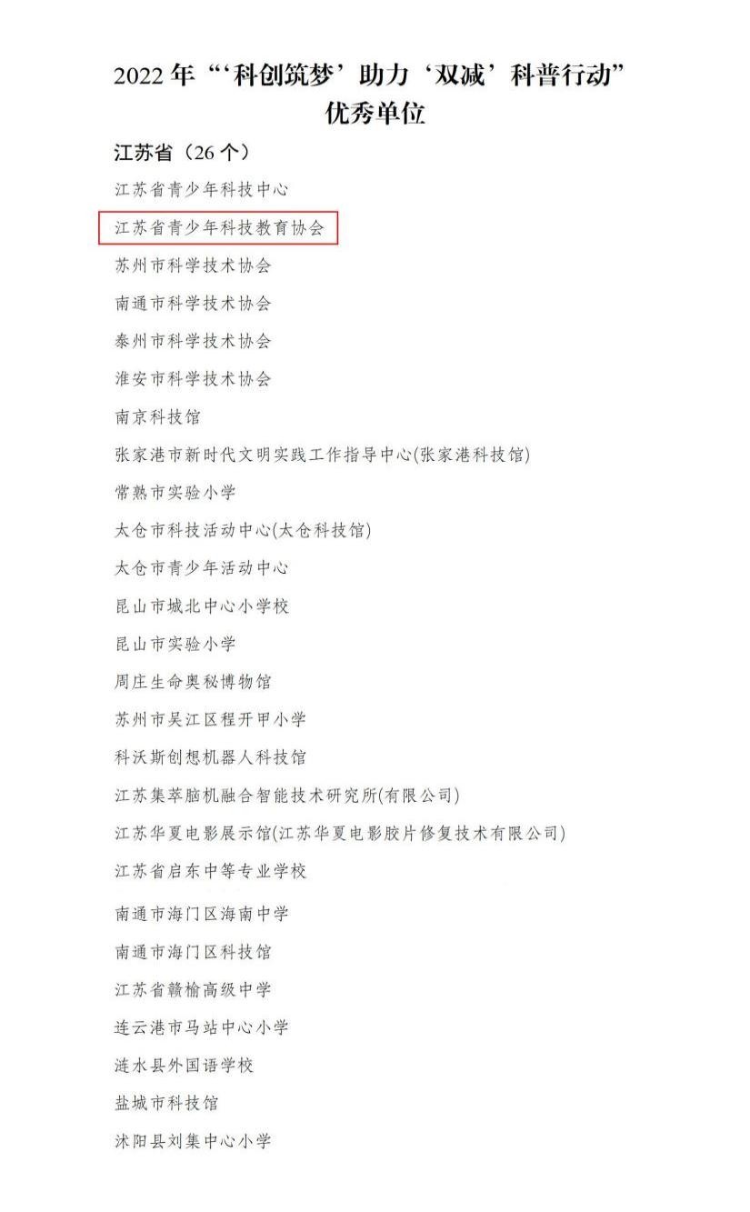 “科创筑梦”云平台由中国科协青少年科技中心、中国青少年科技辅导员协会联合打造,致力于汇聚学校、科研院所、科技场馆、企业资源,整合全国学会、地方科协力量,打造科创活动中心、科教资源中心、项目式学习中心。2021年,betway软件和江苏省青少年科技中心共同承接云平台在江苏的建设工作,江苏成为首个“科创筑梦”云平台示范区,协会成为全国首批“科创筑梦”示范推广单位。2022年发动苏州、南通、淮安、泰州4市入选全国“‘科创筑梦’助力‘双减’科普行动”试点城市,开展科教资源区域服务模式研究及推广,组织发动59个试点单位参与线上线下活动,其中24个试点单位与我协会、江苏省青少年科技中心共同获得2022年“‘科创筑梦’助力‘双减’科普行动”优秀单位。