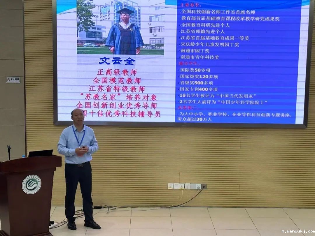 江苏省启东中学正高级教师文云全在会上分享了自己在科创教育方面的探索与实践经验。文云全所带领的学生团队累计获得国际级、国家级奖项170余项,获得国家级专利400余项。他慷慨分享了在科创方向,如何对学生的创新思维进行引导,如何有效激发学生自身潜力,并讲述了几个优秀事例。