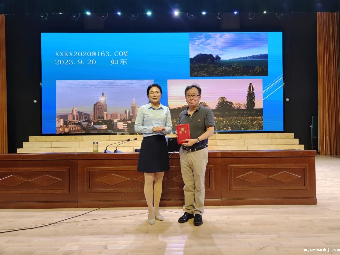 同期开展的如东科技辅导员培训班由江苏省教育科学研究院中小学教研室教研员、正高级教师卢新祁老师带来名为《立足核心素养发展的科技辅导员成长之路》的报告,内容核心为科技辅导员的职业发展提供了专业指导,指出科技辅导员应不断持续学习,提升自身专业技能和教学水平,带领学生开展科技教育实践活动,共同培育出具备科学家潜质、愿意献身科学研究事业的青少年群体。台下教师聚精会神,伴随此起彼伏的笔记声。培训结束后由沈霞校长为卢新祁教研员颁发聘书。