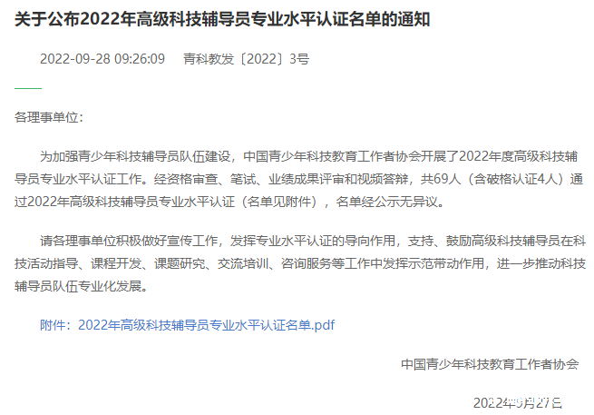中国青少年科技教育工作者协会关于公布2022年高级青少年科技辅导员专业水平认证名单的通知
