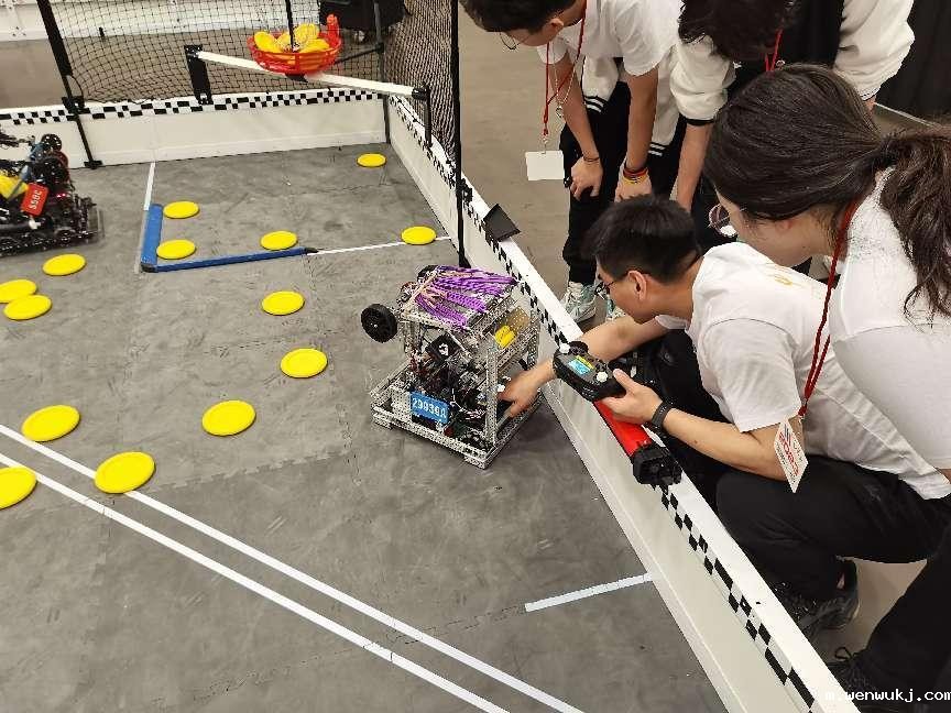 此外,在正式比赛的前夕,我省队伍教练员、操作手携检录好的机器人往返于练习区,对机器人进行最后的调试。随着电机疯狂运转的呲呲声、飞盘落入高框发出的哐当声、观练队员的欢呼声,所有人激情高涨,比赛一触即发。